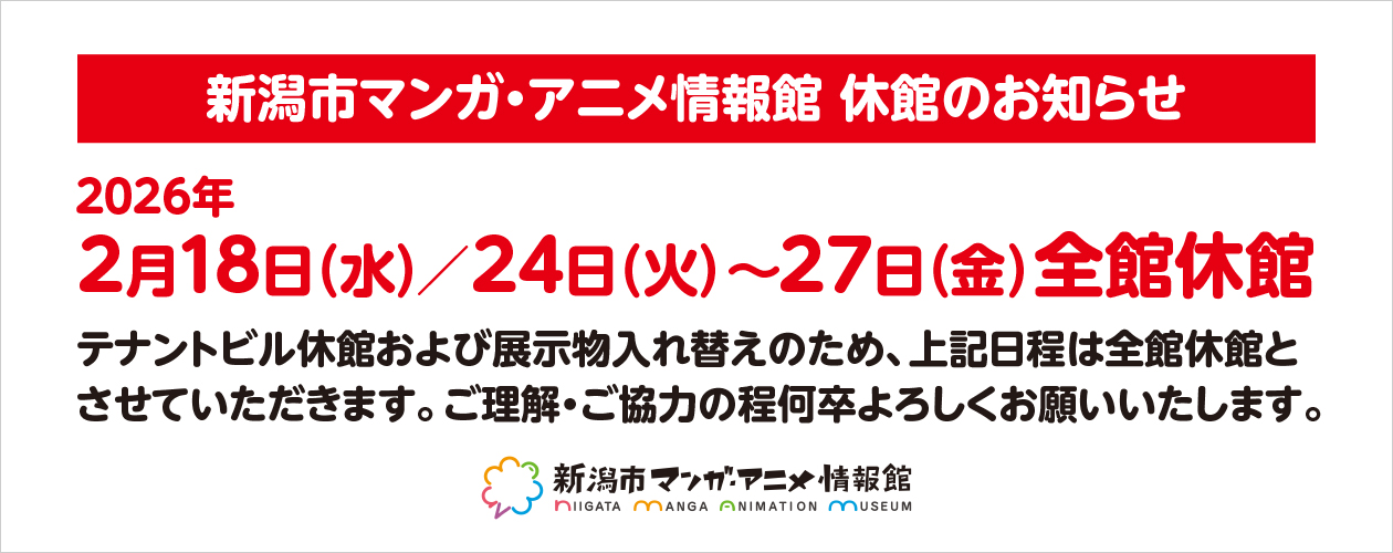 新潟市マンガ・アニメ情報館は下記の期間におきまして、全館休館とさせていただきます。 ********** ■2026年2月18日(水) テナントビル休館のため全… 続きを読む