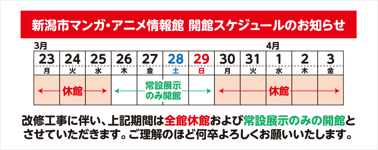 新潟市マンガ・アニメ情報館は下記の期間におきまして、全館休館および常設展示のみの開館とさせていただきます。 ********** ■2026年3月23日(月)〜… 続きを読む